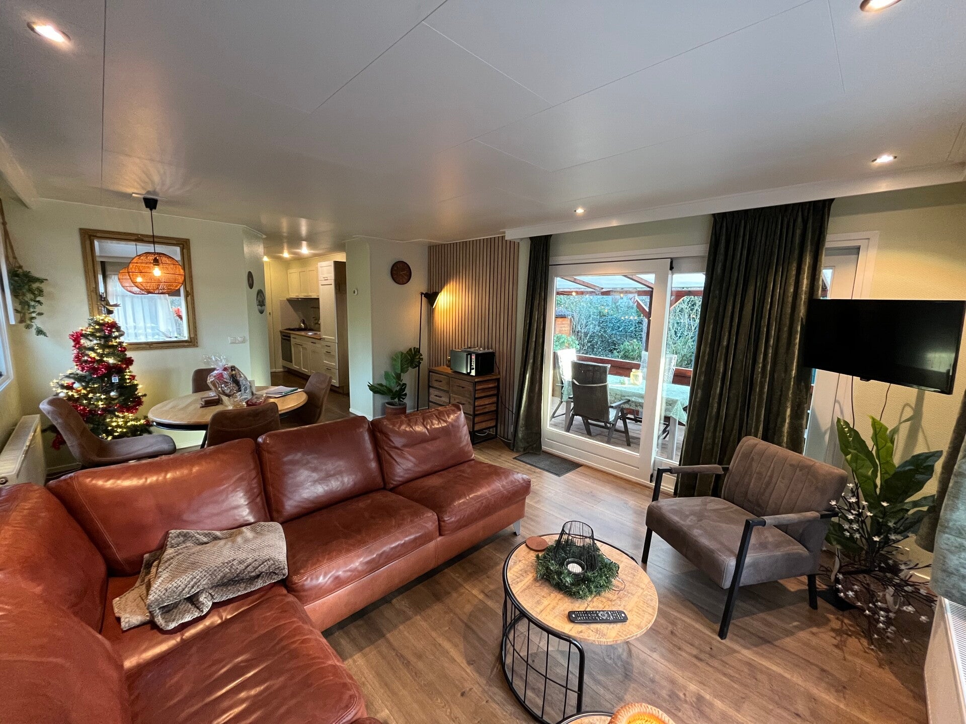 Woonkamer: In de woonkamer vindt u een 4 persoons eetkamer set, ruime hoekbank, televisie en openslaande deuren naar de overkapte veranda. Vanuit de woonkamer loopt u zo de veranda op.